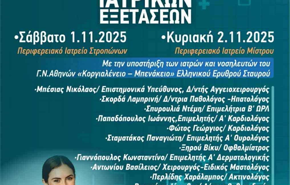 - Το Σάββατο 1 Νοεμβρίου 2025 στο Περιφερειακό Ιατρείο Στροπώνων και ώρα 10:30 &