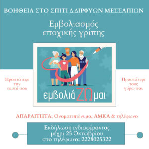 Ο Δήμος Διρφύων- Μεσσαπίων στα πλαίσια εφαρμογής προγραμμάτων πρόληψης και προαγωγής υγείας και σε συνεργασία με την υπηρεσία «Βοήθεια στο σπίτι», συμβάλλει στον εμβολιασμό της εποχικής γρίπης σε άτομα του Δήμου Διρφύων – Μεσσαπίων με σκοπό την προστασία των ομάδων υψηλού κινδύνου.
