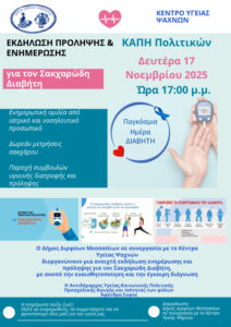 Ο Δ. Διρφύων Μεσσαπίων σε συνεργασία με το Κέντρο Υγείας Ψαχνών διοργανώνουν μια ανοιχτή εκδήλωση ενημέρωσης και πρόληψης για τον σακχαρώδη διαβήτη στο ΚΑΠΗ Πολιτικών την Δευτέρα 17 Νοεμβρίου 2025 και ώρα17:00, με σκοπό την ευαισθητοποίηση και την έγκαιρη διάγνωση.